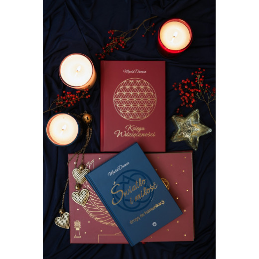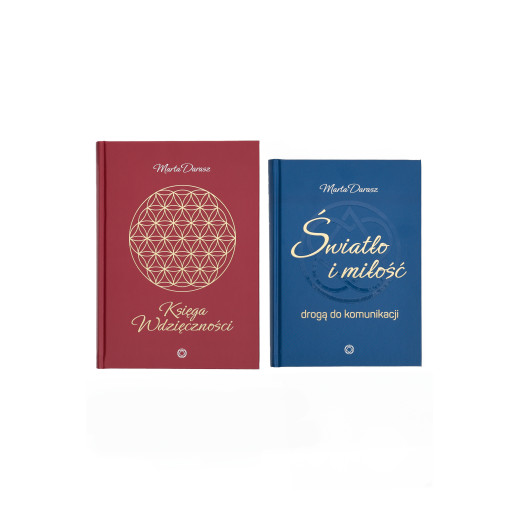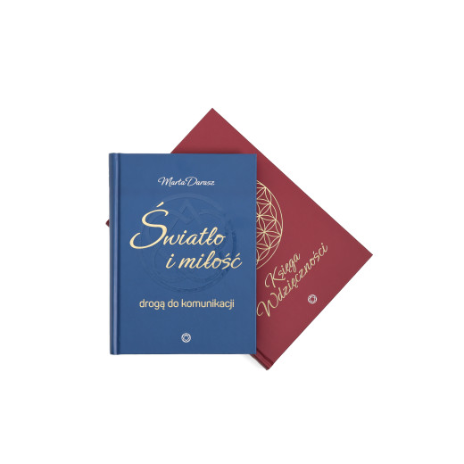 Dwa produkty, które razem tworzą osobistą przestrzeń przemiany – Księga Wdzięczności (wersja de lux) oraz Światło i miłość droga do komunikacji. To połączenie, które otwiera serce, uspokaja umysł i prowadzi Cię krok po kroku do wewnętrznej harmonii, pewności siebie i dojrzałych relacji.